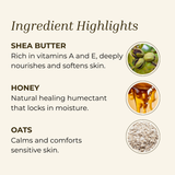 Aqua, *Butyrospermum Parkii (Shea Butter), Glyceryl Stearate, Emulsifying Wax NF, +Helianthus Annuus (Sunflower) Seed Oil, Cetyl Alcohol, Tocopherol (Vitamin E), *Argania Spinosa (Argan) Kernel Oil, *Theobroma Cacao (Cocoa) Seed Butter, +Honey, Glycerin, *+Avena Sativa (Oat Kernel) Flour, Chamomilla Recutita (Matricaria) Flower Extract, Cucumis Sativus (Cucumber) Fruit Extract, Rosmarinus Officinalis (Rosemary) Leaf Extract, Fragrance, Thymus Vulgaris (Thyme) Leaf Oil, Phenoxyethanol.