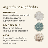 Magnesium Sulfate (Epsom Salt), Sodium Chloride (Dead Sea Salt), *+Avena Sativa (Oat Kernel) Flour, Eucalyptus Globulus (Eucalyptus) Oil.