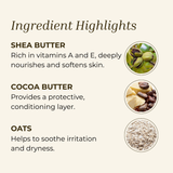 Aqua (Water), *Butyrospermum Parkii (Shea Butter), Cetyl Alcohol, +Helianthus Annuus (Sunflower) Seed Oil, Emulsifying Wax NF, Glyceryl Stearate, *Theobroma Cacao (Cocoa) Seed Butter, Tocopheryl (Vitamin E), Persea Gratissima (Avocado) Oil, Chamomilla Recutita (Matricaria) Flower Extract, Cucumis Sativus (Cucumber) Fruit Extract, Rosmarinus Officinalis (Rosemary) Leaf Extract, Glycerin, Phenoxyethanol, +Honey, *+Avena Sativa (Oat Kernel) Flour, Polysorbate 20.