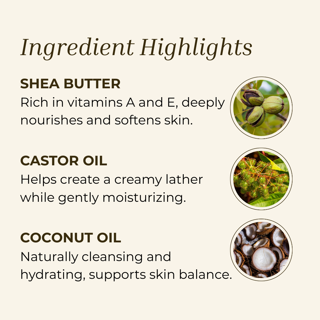 Hydration in every wash. Made with a rich blend of Shea Butter, Coconut Oil, Sunflower Seed Oil, and Castor Oil, this bar cleanses while keeping skin smooth, soft, and replenished.