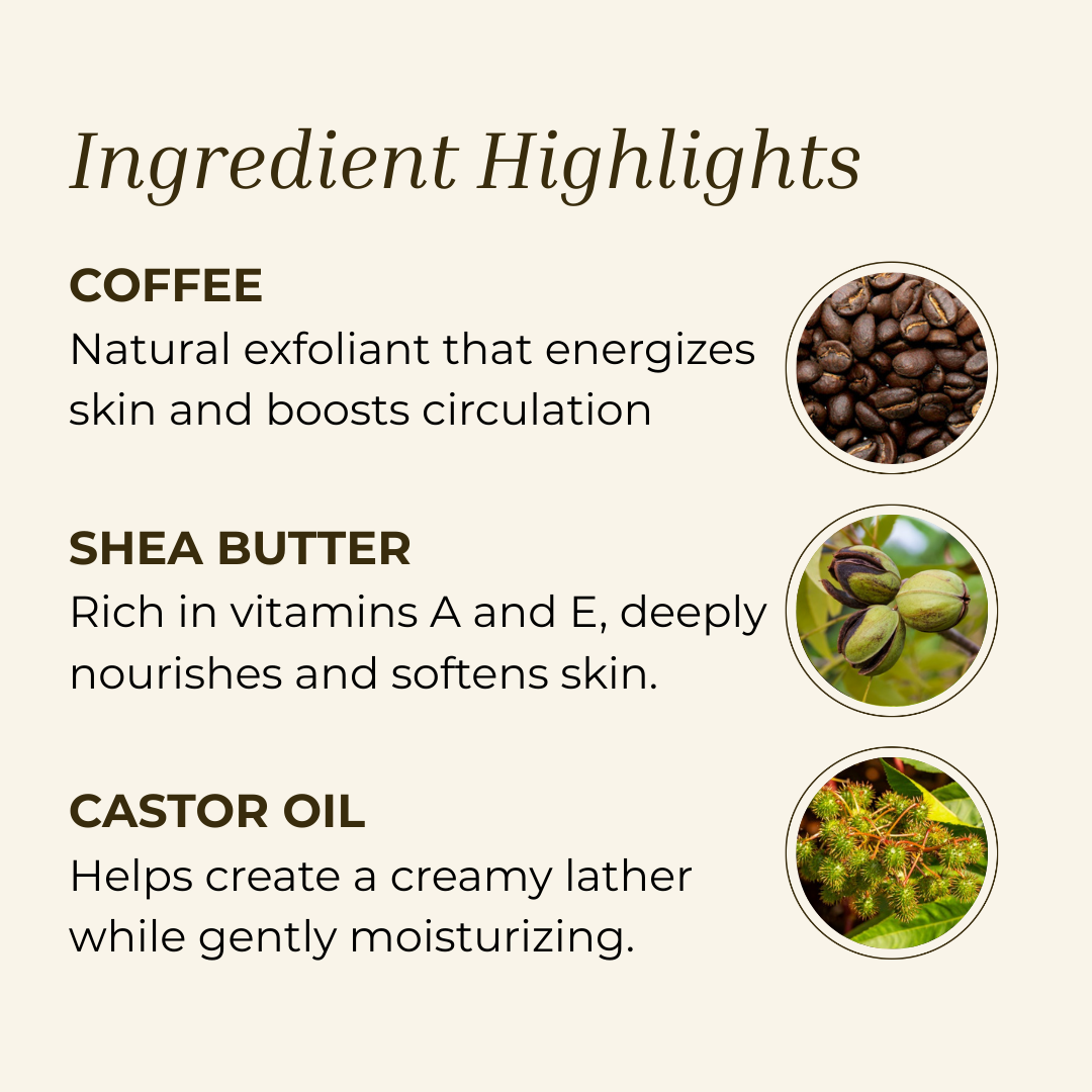 Cozy exfoliation with festive flair. Crafted with Coffee Grounds, Shea Butter, Coconut Oil, and Sunflower Seed Oil, this medium-grit bar polishes away dryness while nourishing skin.